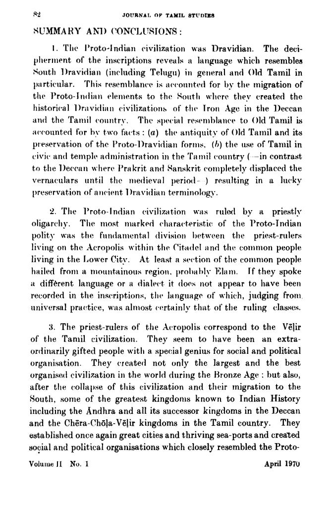 The long quest for an understanding of this script an exciting and perhaps a decisive phase with the recent publication of the preliminary achieved by the Soviet and Finnish teams of scholars working in the field. Their work has placed the investigations for the first time on a scientific basis and represents a major break-through. The methodology adopted by both teams is broadly the same. While there are differences in the identification of individual signs, as there are bound to be at this preliminary stage, both the teams are agreed on three fundamental results (a) the language is Dravidian. (b) the signs are logographic and based on the principle of homophony, and (c) the inscriptions generally read from right to left. I acknowledge my indebtness to the pioneering work of the Soviet and Finnish teams and my work should be considered as following up their break-through.