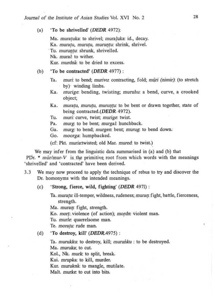 The basic Dravidian word mur (Ta. muri, Ka. muruhu, Pa., Ga. murg. Go. moorga etc., DEDR. 4977) means ‘to bend, contract, fold ‘ etc. Applying the technique of rebus, we get mur (Ta. murunku, murukku; Ma. murukka, Kol., Nk. murk, Malt. murke etc., DEDR 4975) meaning ‘to destroy, kill,