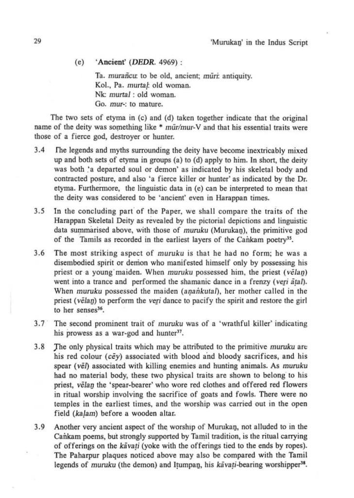 3.11 The muruku of the early Tamil society before the Age of Sanskritization was a primitive tribal god conceived as a ‘demon’ who possessed people arid as a ‘wrathful killer or hunter’. This characterisation of the earliest Tamil muruku is in complete accord with his descent from the Harappan Skeletal Deity with similar traits revealed through pictorial depictions, early myths and Dravidian linguistic data.